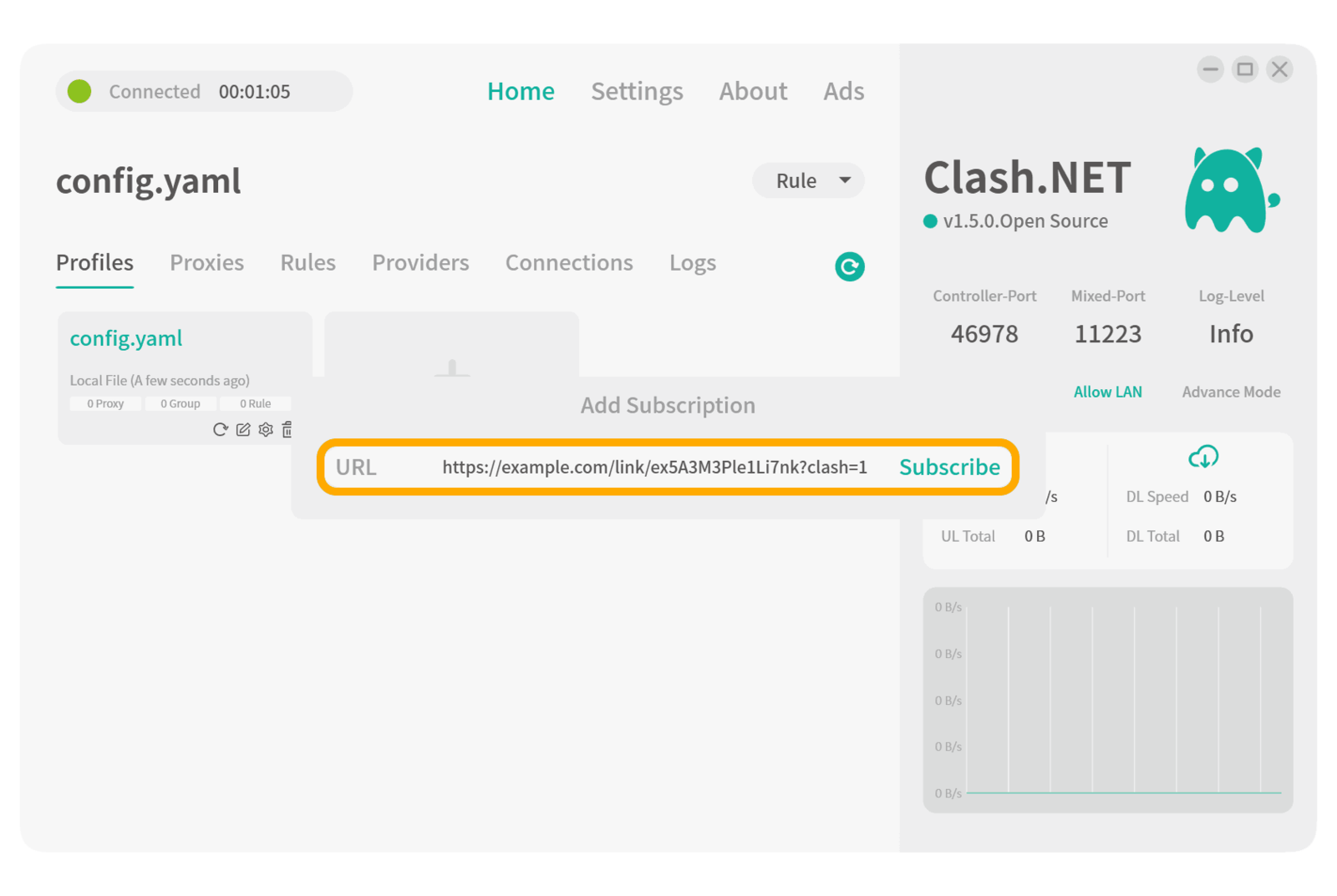 在 Add Subscription(添加订阅) 输入框中,粘贴 Clash 配置订阅链接,随后点击 Subscribe(订阅) 下载配置文件。