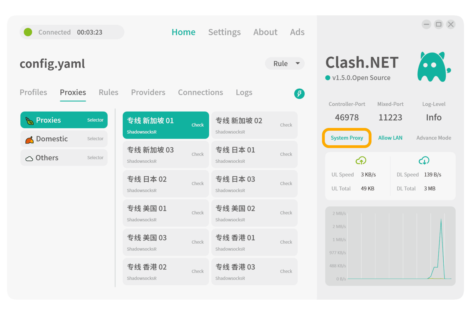 点击窗口右侧的 System Proxy (系统代理),Clash.NET 便开始接管系统流量。