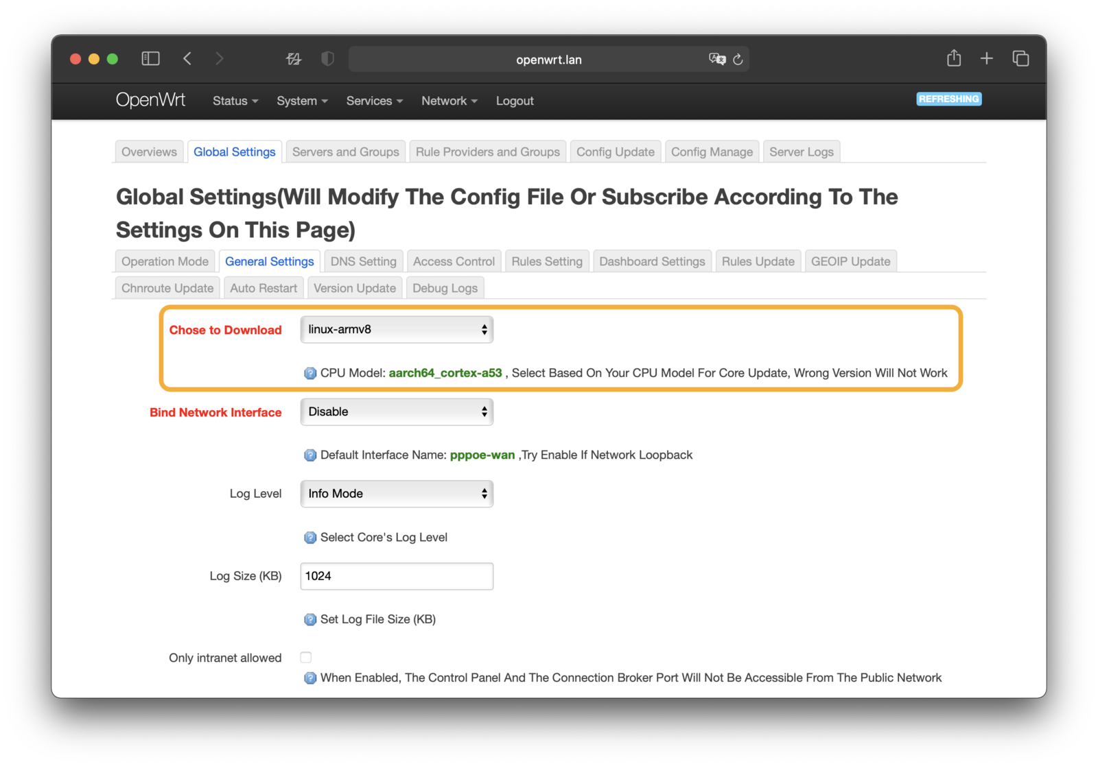 如果第一次使用 OpenClash,需要手动选择内核编译版本。否则可跳过此步骤。