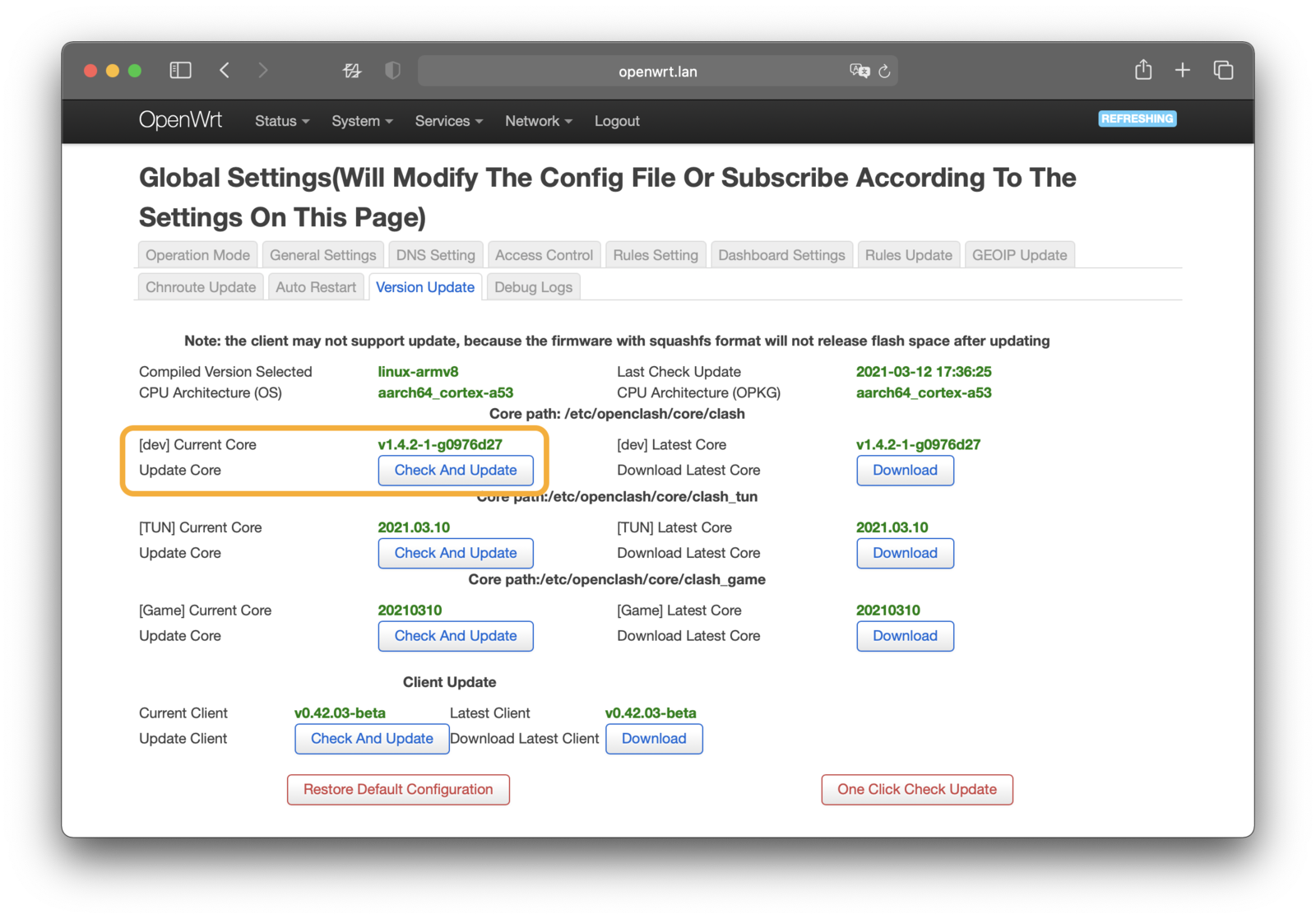 进入 “Version Update (版本更新)”,点击 Dev 内核后的 “Check and Update (检查并更新)” 。
