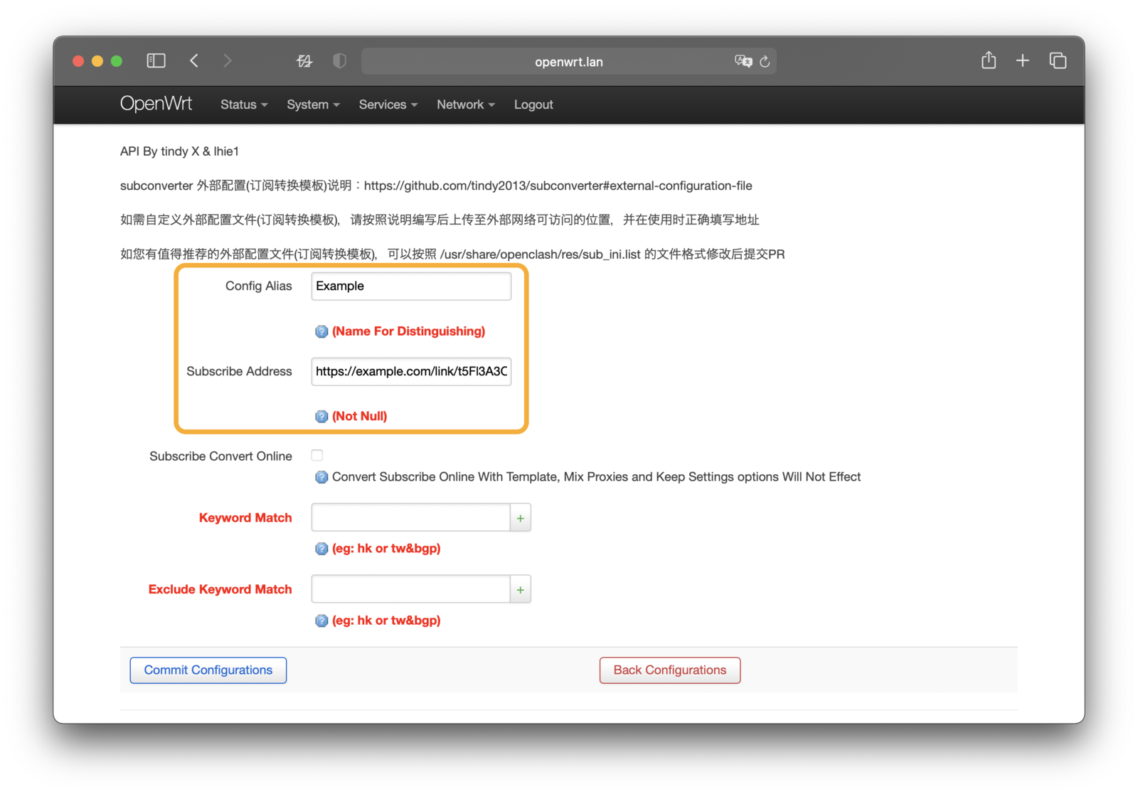 点击 “Add (添加)” 按钮,键入 “Config Alias (配置文件名)” 和 “Subscribe Address (订阅地址)” 。
