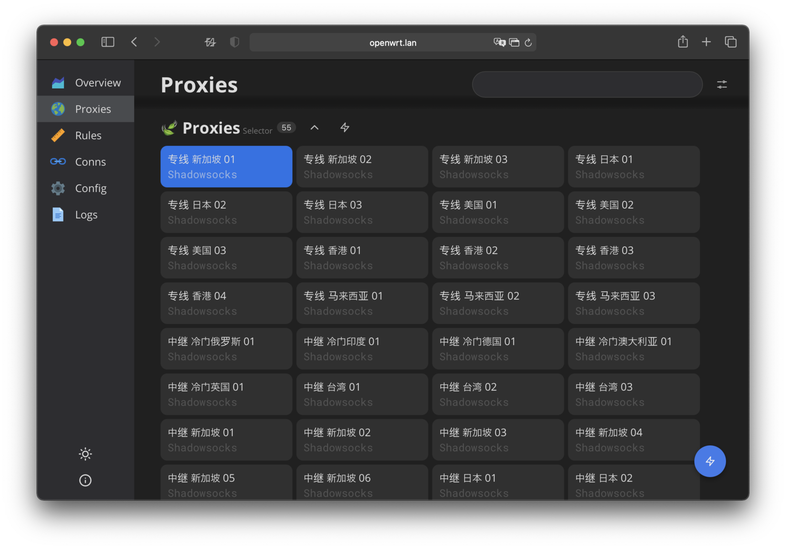 点击页面左侧的 Proxies (代理),在 ?? Proxies 策略组中选择需要使用的节点。