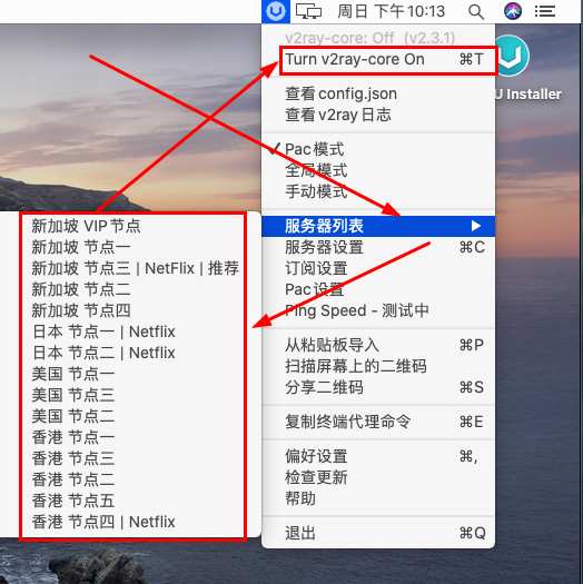 成功更新后,前往「服务器列表」选择速度较快的节点> 「Turn v2ray-core On」开启app,即可连结国际互联网。